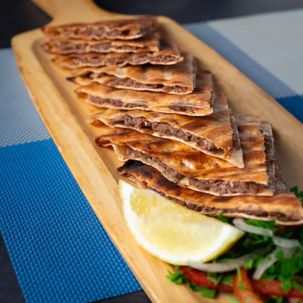 Kufta spread on toasted arabic bread with pomegranate molasses.