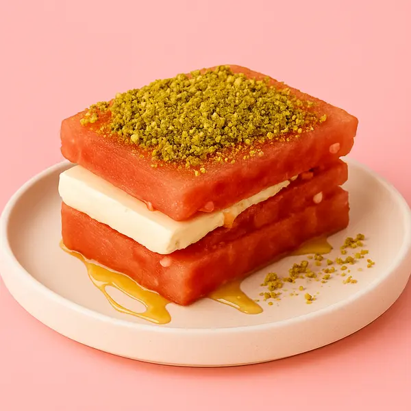 Two layers of juicy watermelon with a slice of halumi cheese in between drizzled with honey and pistachio crumbs