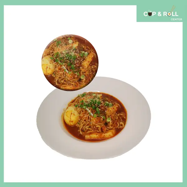Традиционно ястие приготвено от оризов кейк, леко пикантна паста гочуджанг,рамьон на марка индоми, соев сос и яйце. украсено със зелен лук и сусам. (450g.) алергени: сусам, глутен, соя, яйца