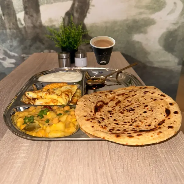 Chane, egg omelette, dahi, 2 lacha paratha and cup of tea